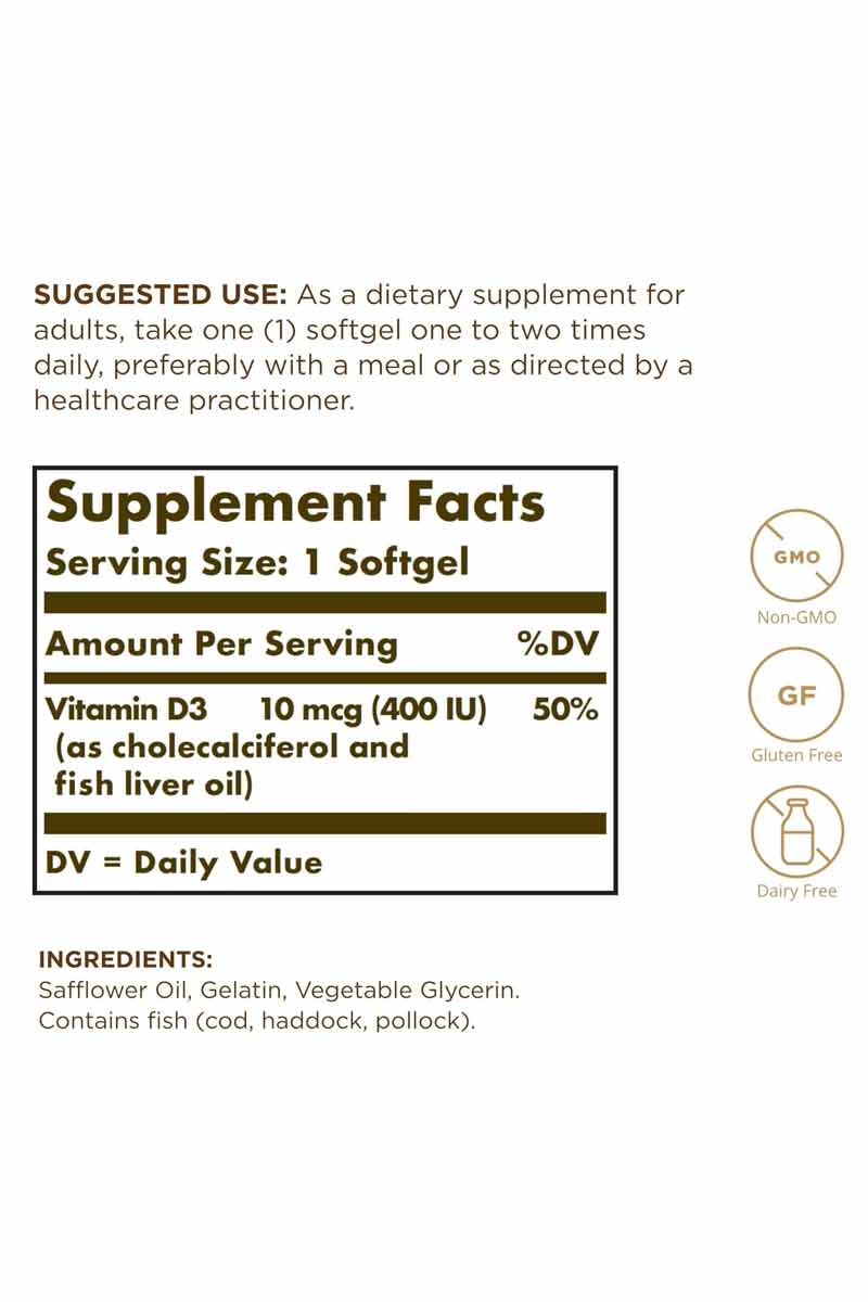 Solgar Vitamin D3 10 Mcg ( 400 iu ) 250 Softgels