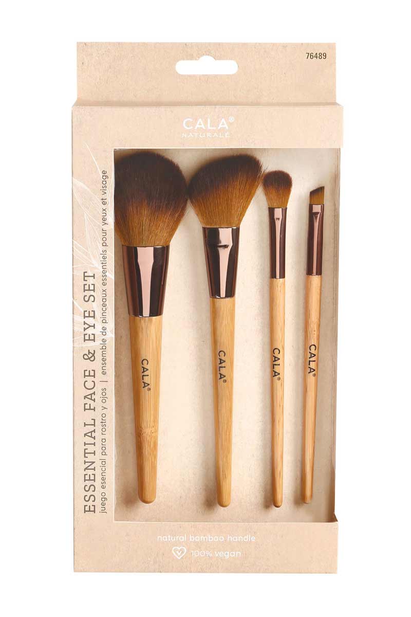 El Set Esencial para Rostro y Ojos está hecho con cerdas veganas de alta calidad y está diseñado para ayudarte a lograr un look perfecto e inolvidable. Incluye una brocha para polvos, una brocha para rubor, una brocha para sombras de ojos y una brocha inclinada para cejas.