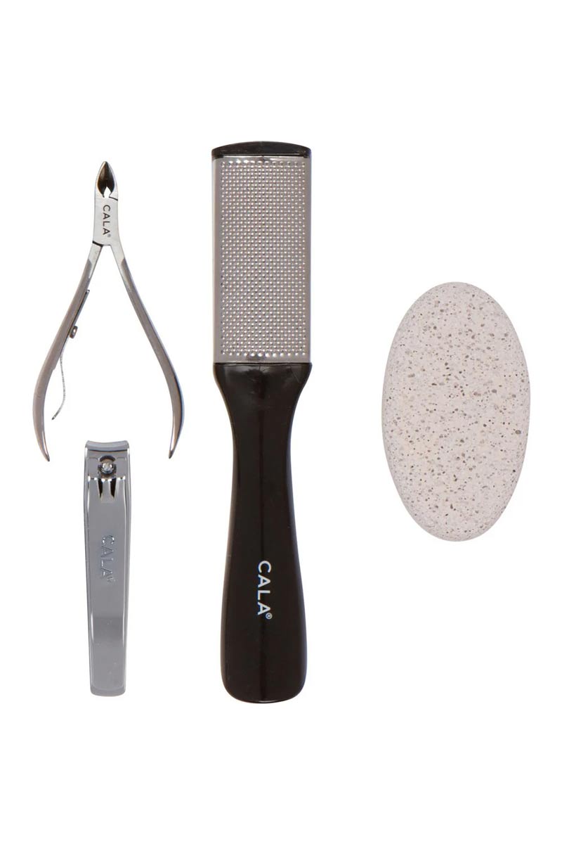Incluye elementos básicos para el cuidado de los pies, como una lima de uñas, un cortaúñas y una piedra pómez.
