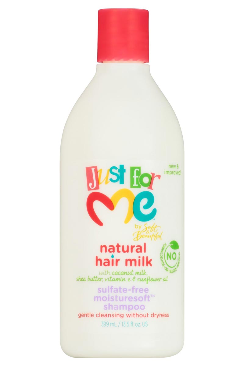 Just For Me Natural Hair Milk Moisture Soft Sulfate-Free Shampoo brinda una alternativa suave que no reseca y no contiene sulfatos que limpia el cabello sin comprometer la rica espuma cremosa que amas.